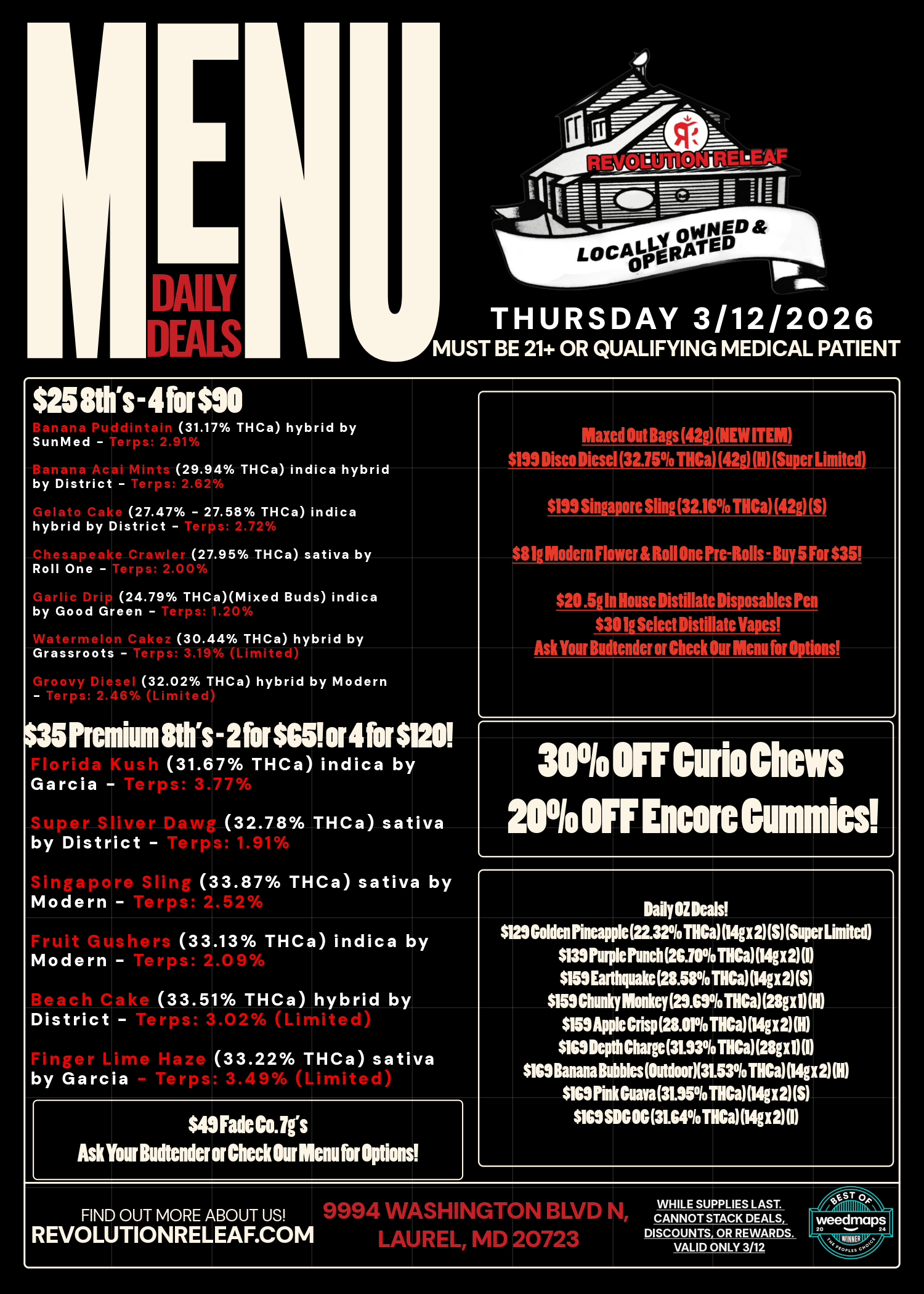 DAILY DEALS & ANNOUNCEMENTS Veterans: 20% OFF • Maryland Medical Cannabis Patients: 20% OFF • Senior (55+): 10% OFF BEST CANNABIS DEALS IN LAUREL, MARYLAND! PLACE AN ORDER ON OUR APP! (APP STORE) PLACE AN ORDER ON OUR APP! (GOOGLE PLAY) Become a maryland medical cannabis patient today & become eligible for 0% cannabis sales tax PLUS 20% off storewide!